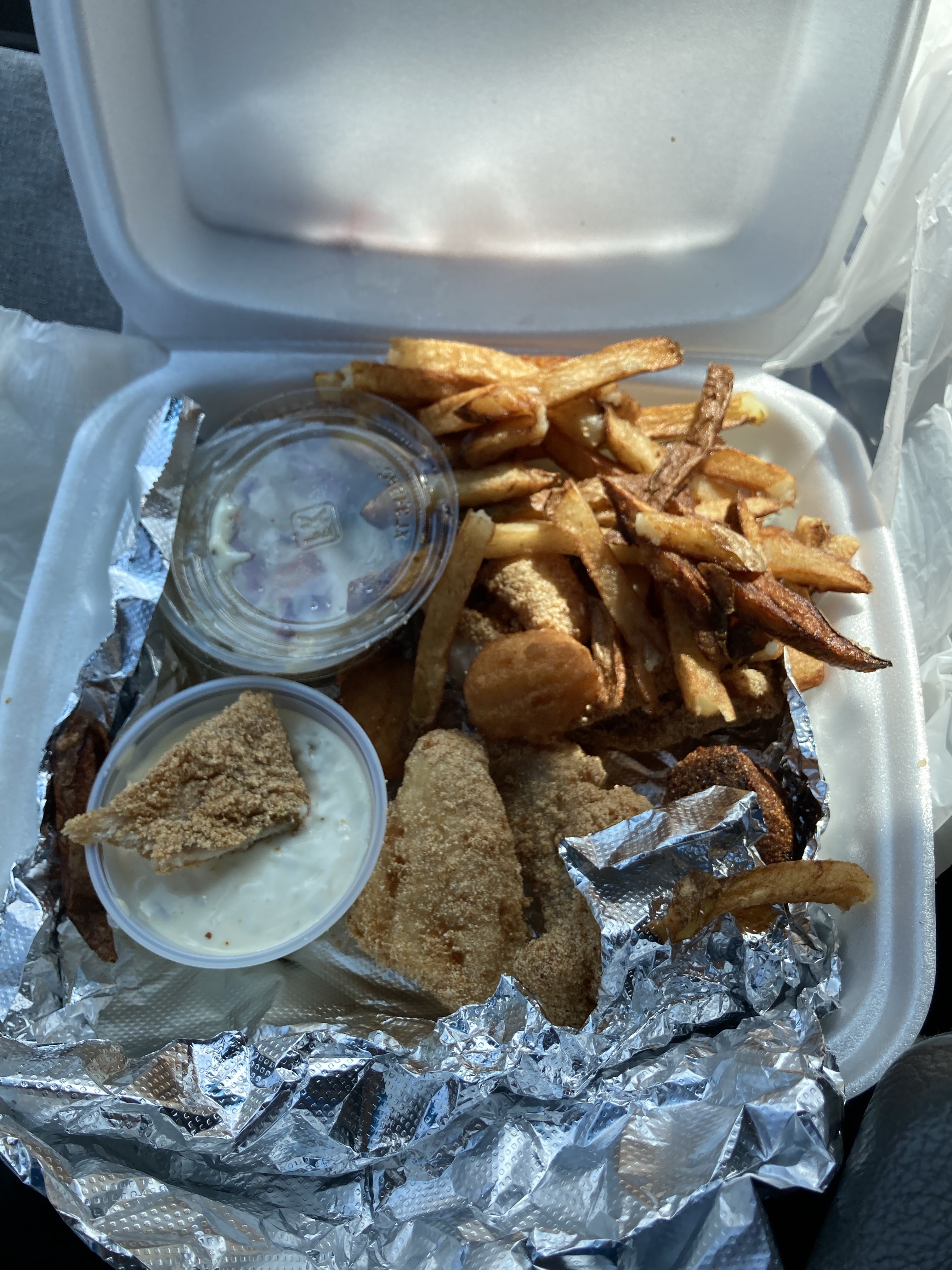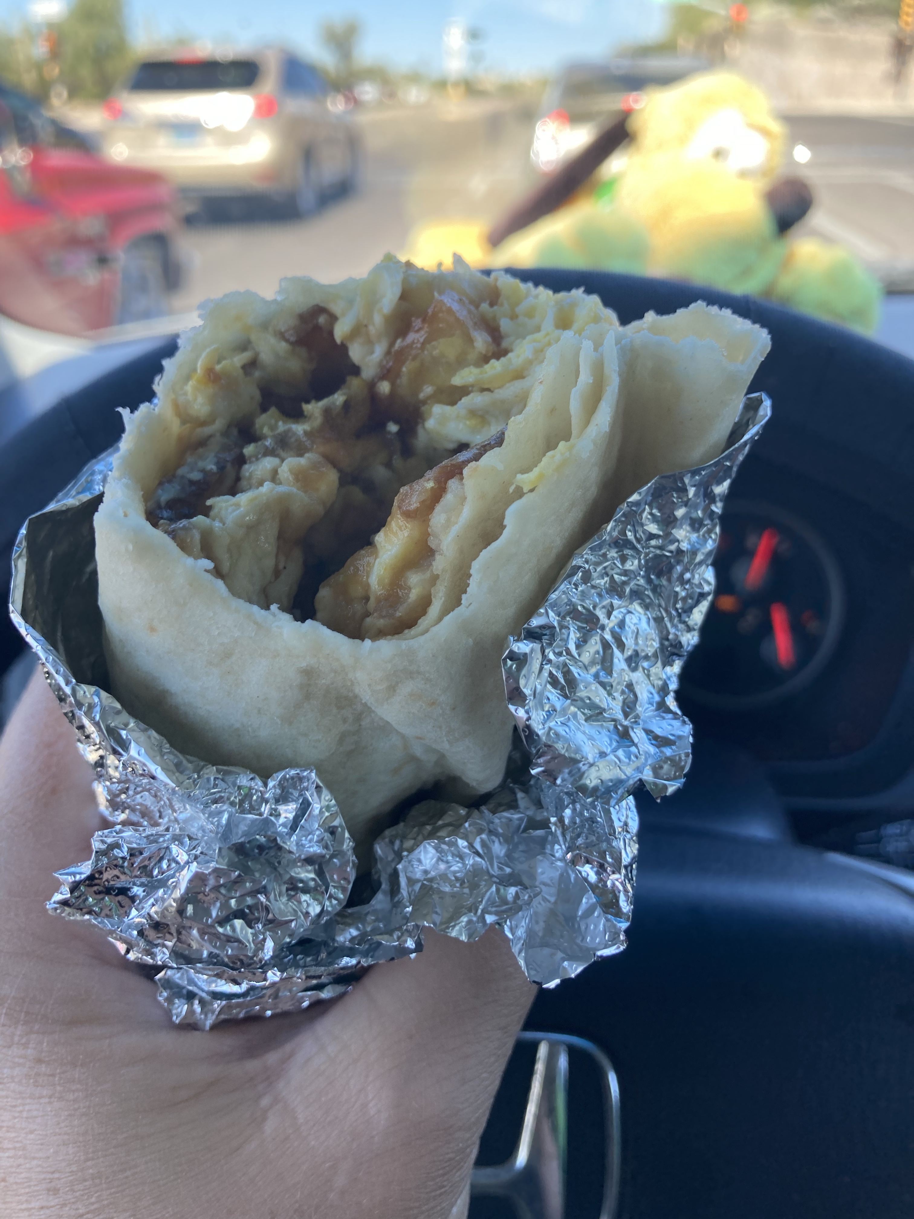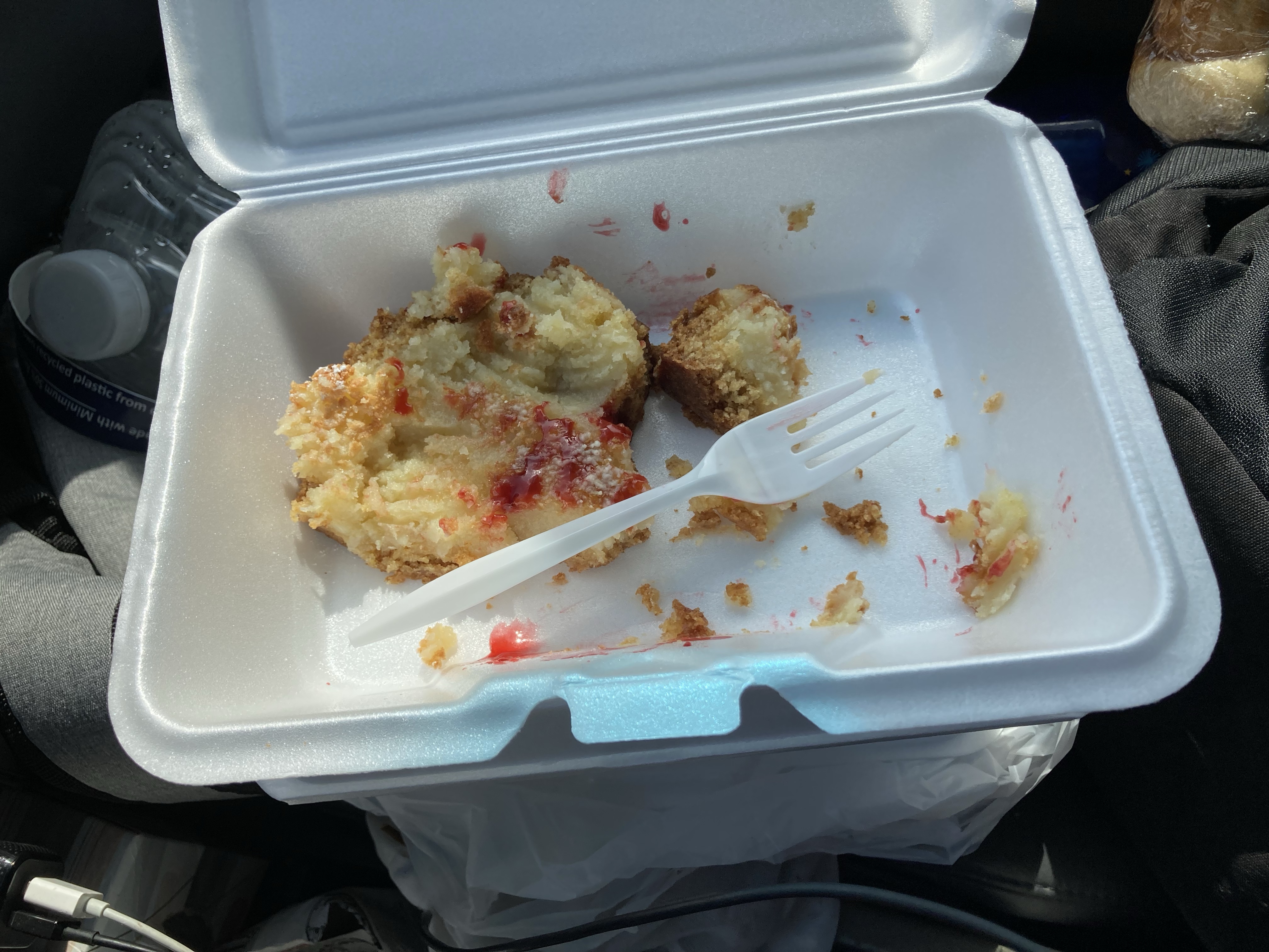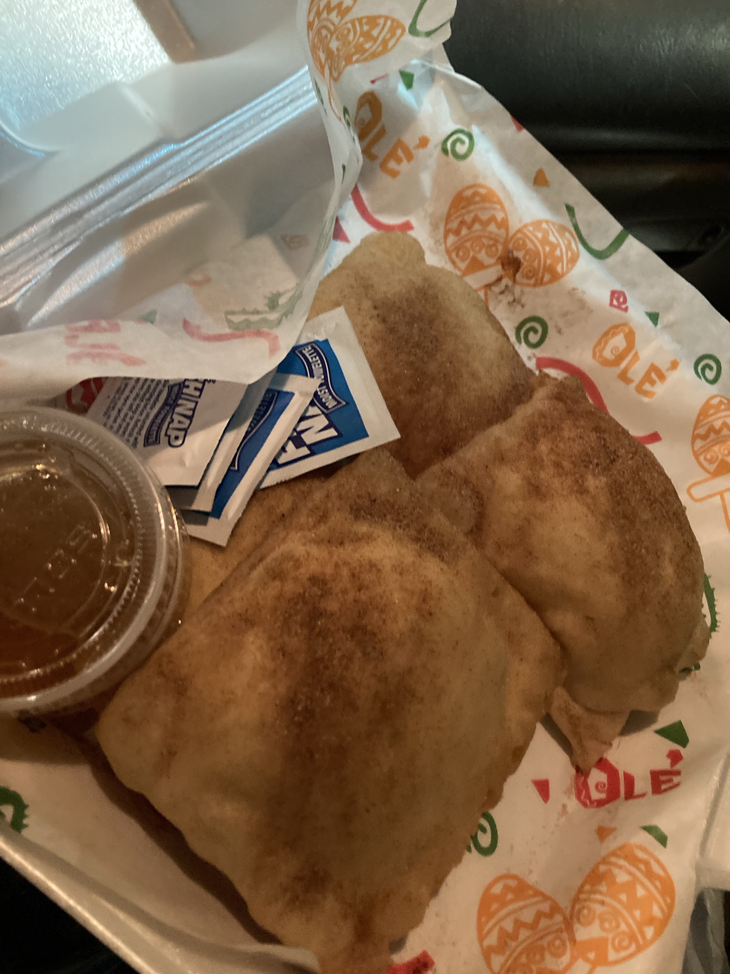 Yummy fry bread takeout from a pretty sketch cafe. I ate it in a well-lit KFC parking lot. Steve can see my location and he texted incredulously that I was eating there. 🙂