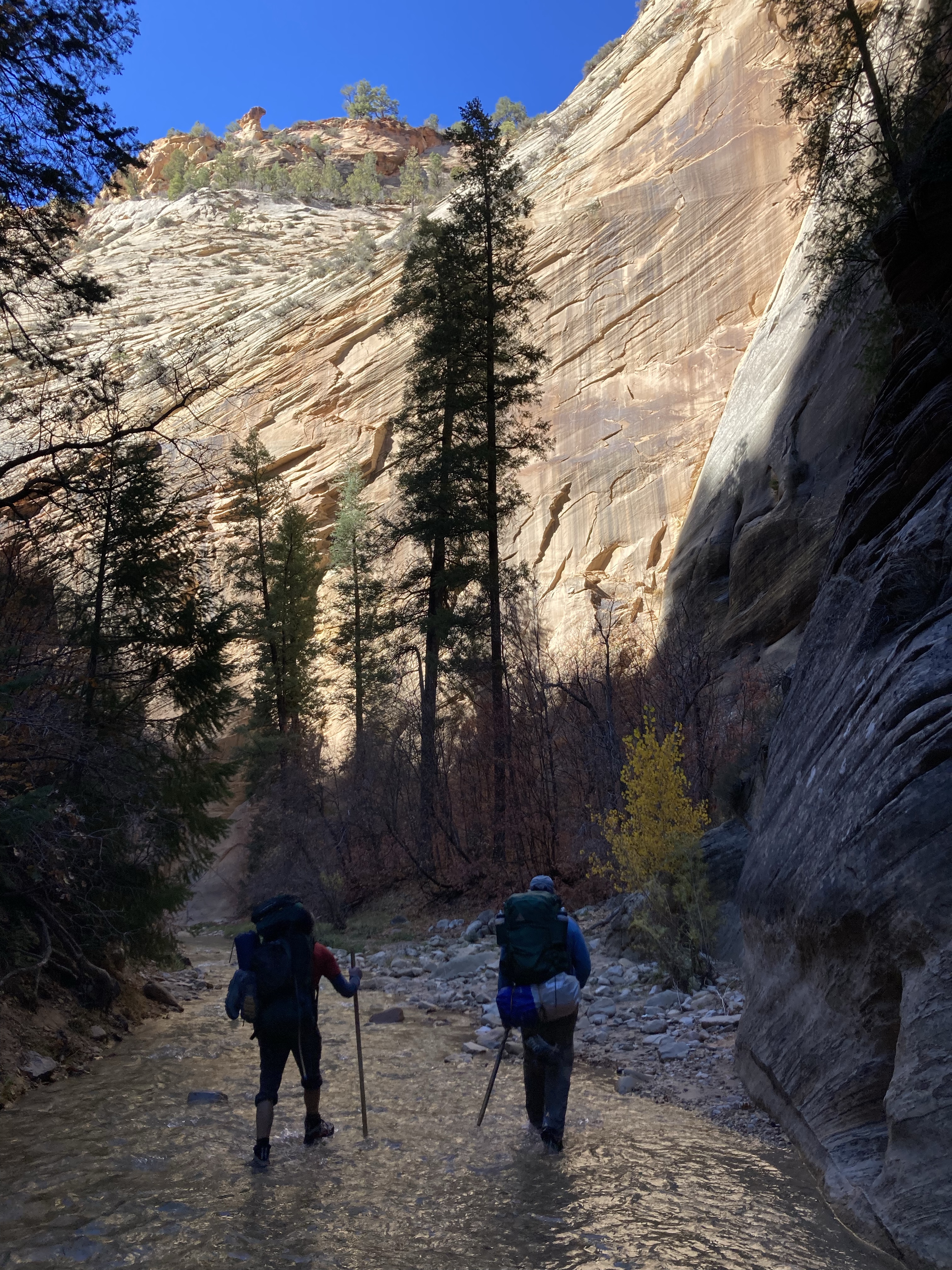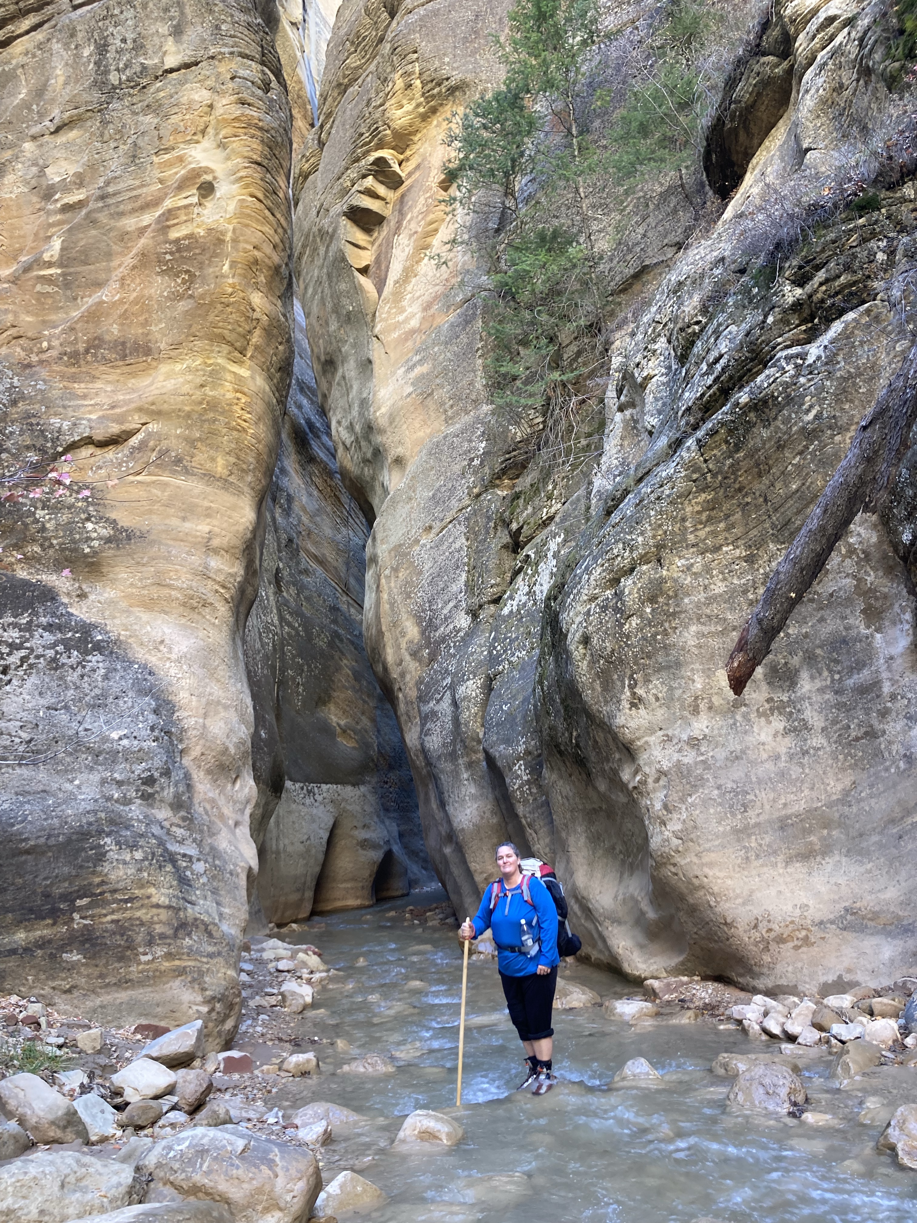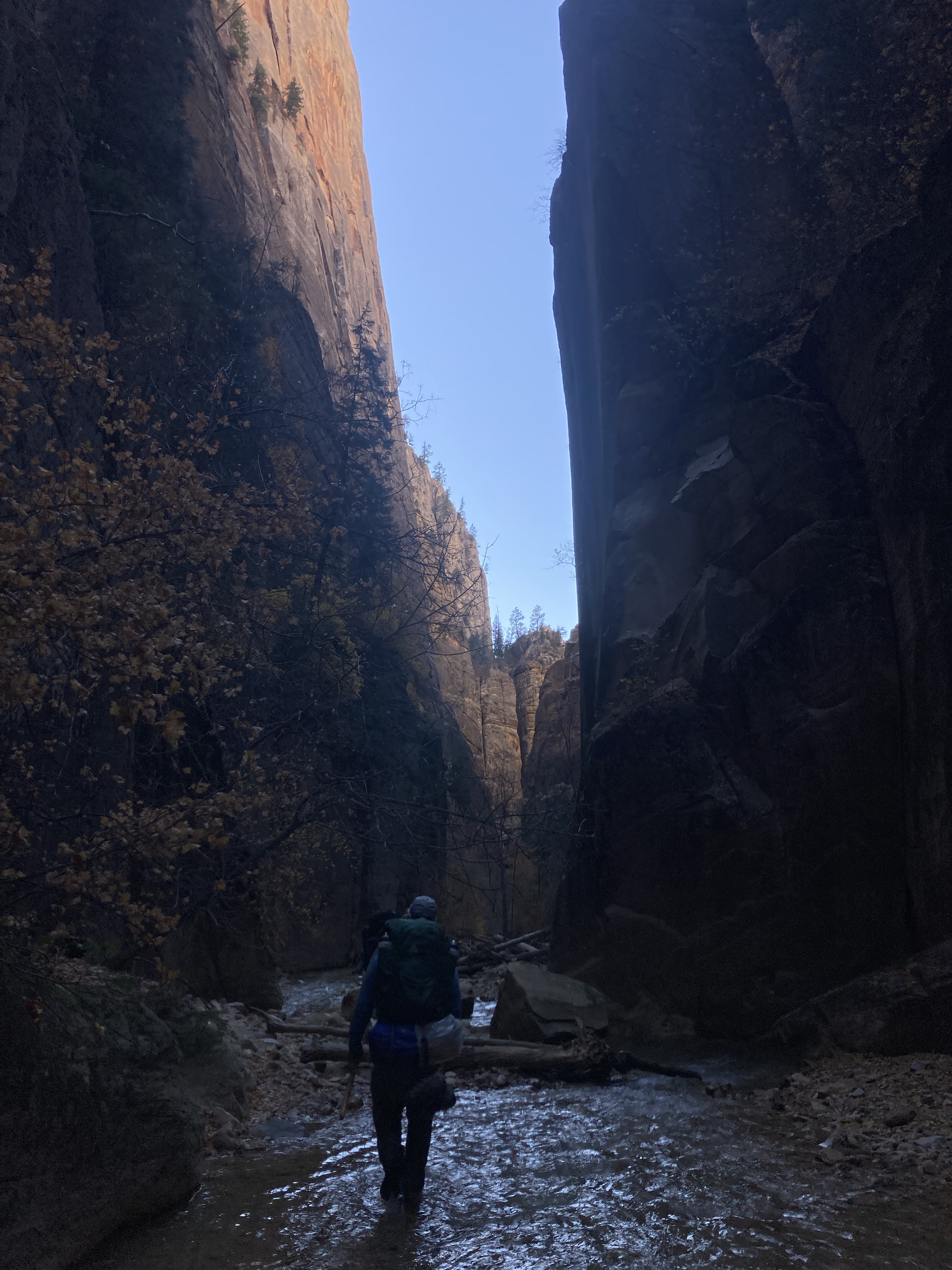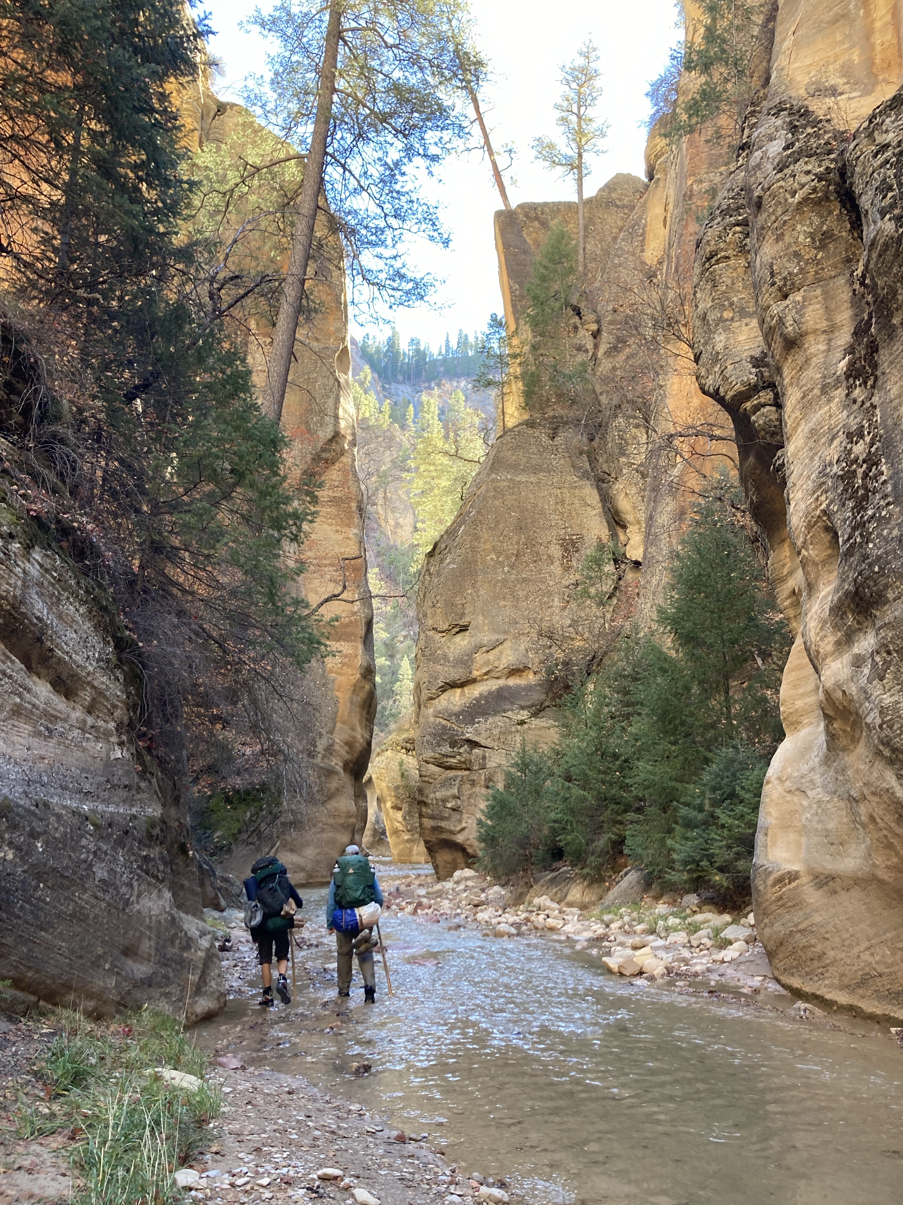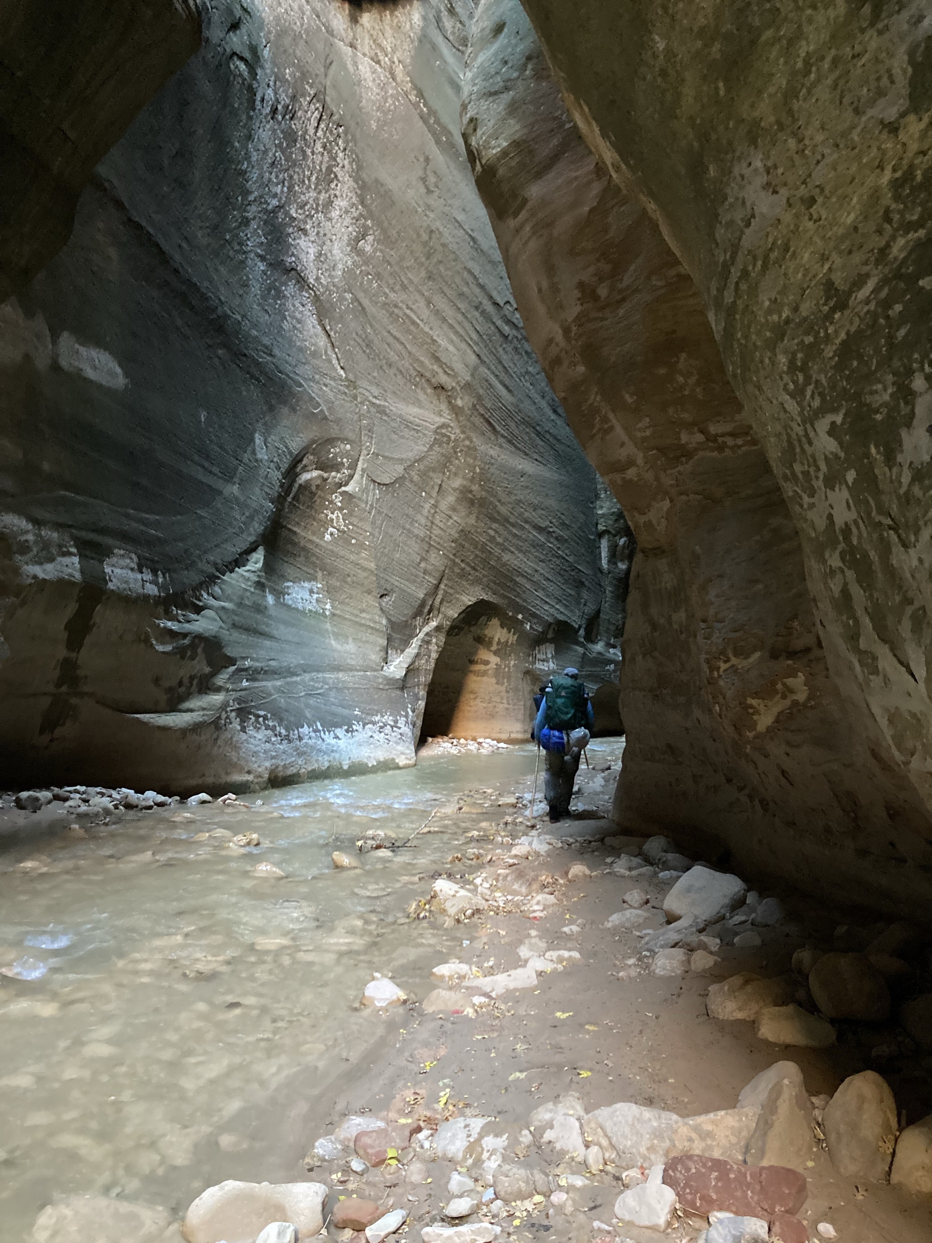 Overnight hike with Ken and Scotty. Very hard and incredibly beautiful! We rented dry suits, neoprene socks, and boots for hiking in water. We stayed at a site along the trail where we set up hammocks (it was so cold!) On day 2, Ken and Scotty took my pack off and on since I was slow and my knee was really hurting me.