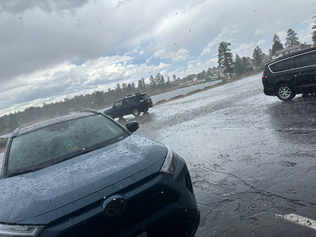 Unfortunately, the bikers were still in it (they sheltered at the general store during the worst of it). Jim slipped on a wet path and injured his shoulder. 😥
